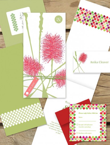 The perfect wedding stationery set for an Australian wedding. See this artistic native applied to your placecard and rsvp card to give you that dream stationery you won't find anywhere else. This contemporary illustration of the bottlebrush truly makes your wedding stationery one of a kind. It's a stunning design whichever way you look at it. If you are having native flowers on your day then this makes this native flower design even more perfect. The RSVP card looks so divine next to the wedding invitation which is complimenting coloured envelope and geometric border pattern. These pictures don't do this beauty justice so please order a sample to see how gorgeous this design is for yourself!